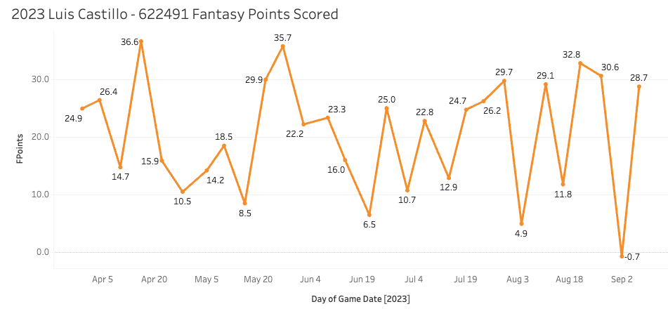 1. Luis Castillo - 622491 (vs. TB): 28.7 Points