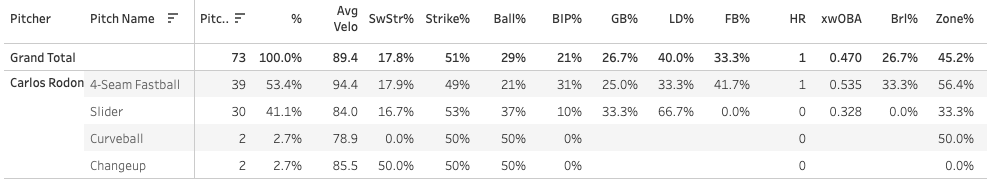 His fastball got hit hard when it was contacted, but again a 17.9% SwStr% and 49% Strike% on the pitch is going to work quite well most of the time.