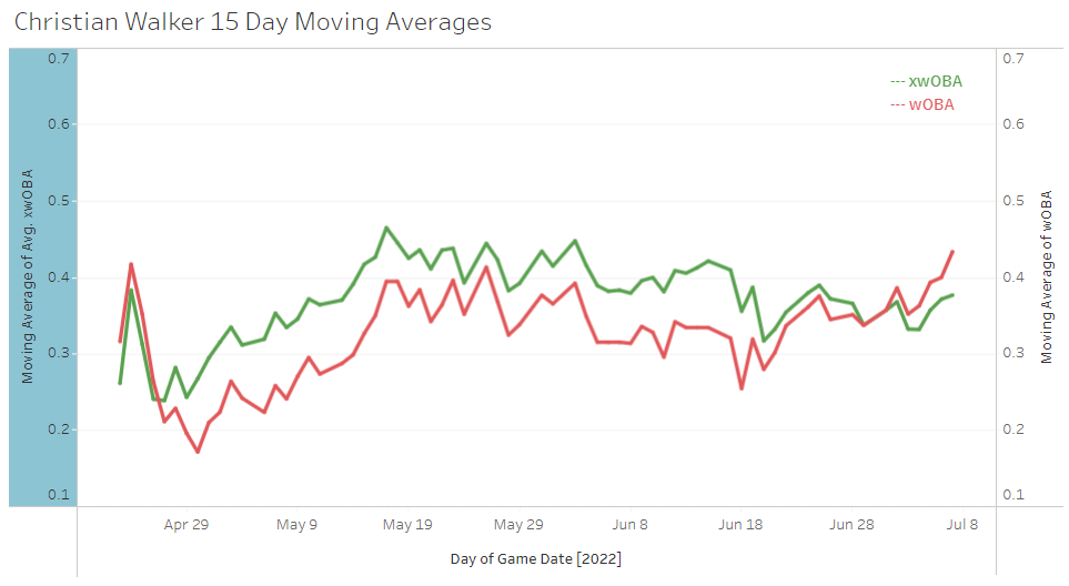I’ve got a plot for just about everything at this point, but I’m not done adding on. I have put together an interactive 15-day moving average plot that compares wOBA to xwOBA. Here is Christian Walker: