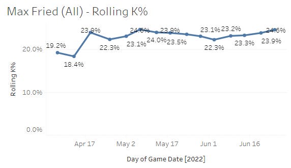 The other standout pitcher (to me at least) was Max Fried, who has really ramped up the strikeouts in recent outings.