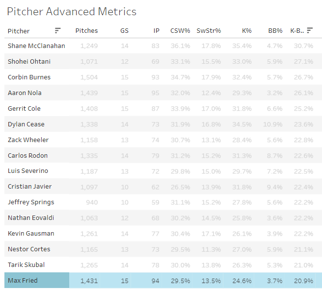 2. Max Fried (ATL): 18.9 SwStr%, 35.8 CSW%