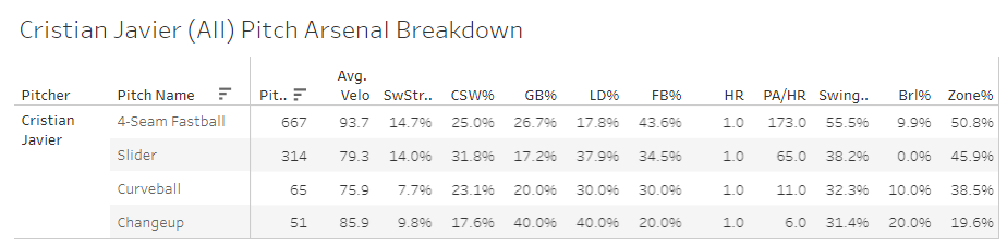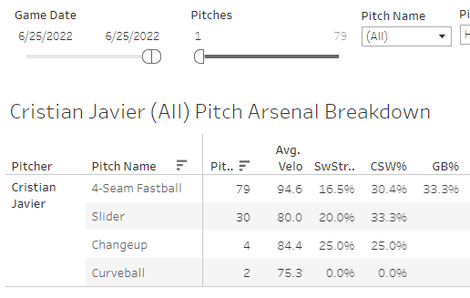 Cristian Javier holy cow! 115 pitches, 20 whiffs, no hits, 13 strikeouts, one walk! And good for those two relievers finishing the job for him.