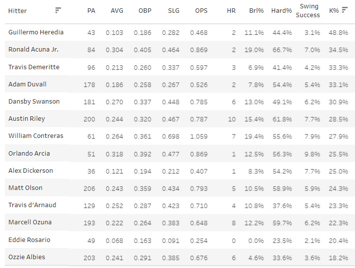 Acuna, Duvall, Swanson, Contreras, and Riley are all regulars well above a 25% strikeout rate.