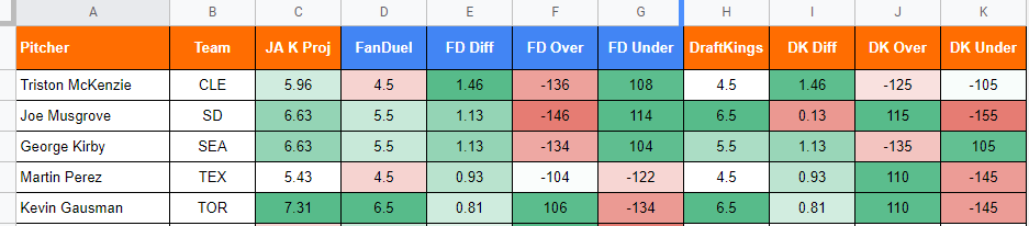 The strikeout comparison sheet that premium subs have access to here is really liking the Joe Musgroves strikeout line on FanDuel.