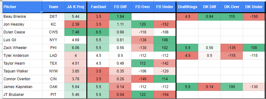 We have some value on Beau Brieske on FanDuel this morning as their line opened at 3.5. The JA model spat out 5.4 strikeouts for this matchup with the Athletics, so there appears to be some value there.