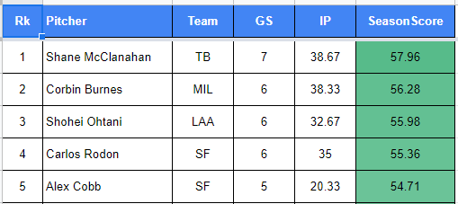 1. Shane McClanahan (TB) - 7.0 GS - 57.96 JA Points