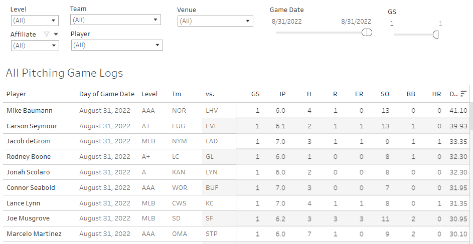 deGrom and company couldn’t touch MIKE BAUMANN or CARSON SEYMOUR, who both struck out 13 batters. Here are the top pitching efforts from all professional levels last night.
