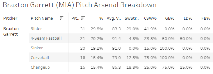 Braxton Garrett - 93 TBF, 36.0% CSW%