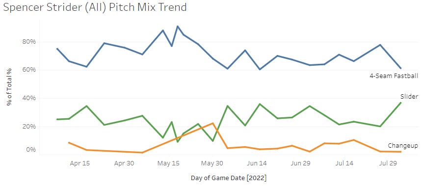 Spencer Strider's SL usage (36.7%) up 11.2 points