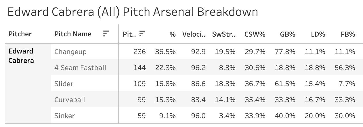 The other very interesting start of the night came from Edward Cabrera. He threw eight scoreless against the Athletics with seven strikeouts and three walks. He’s one of the most interesting pitchers by the numbers that I’ve seen this year, so I want to go over that. For the year: