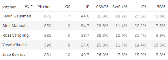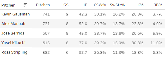 1. Jose Berrios (TOR): 21.3 SwStr%, 45.7 CSW%