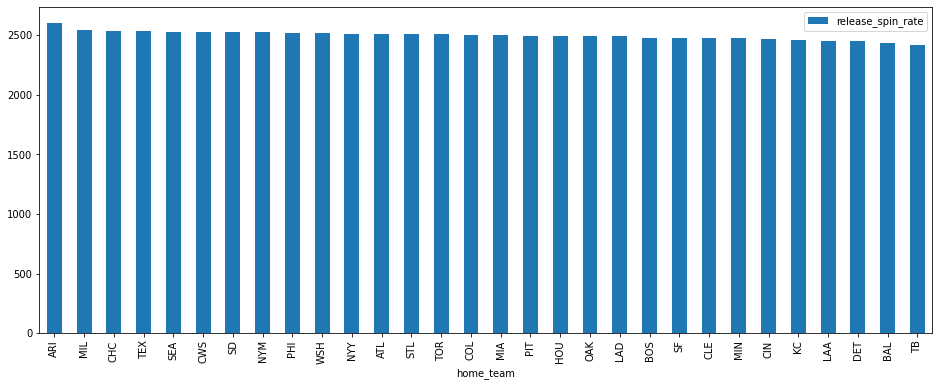 So indeed, a bit more spin at home. That made me take this to the next step to see if all curveballs are spinning more in Toronto, so I checked the average spin rate on curveballs by visiting pitchers at all stadiums (did visiting pitchers because if you do all pitchers, the home pitchers throwing more of their curveballs at home factors in and you just get a list of teams with the highest spin rate pitchers).