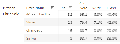 Chris Sale debuted and threw 78 pitches. He put up a great 37.2% K% but a bad 5.1% SwStr%, here’s the stuff breakdown.