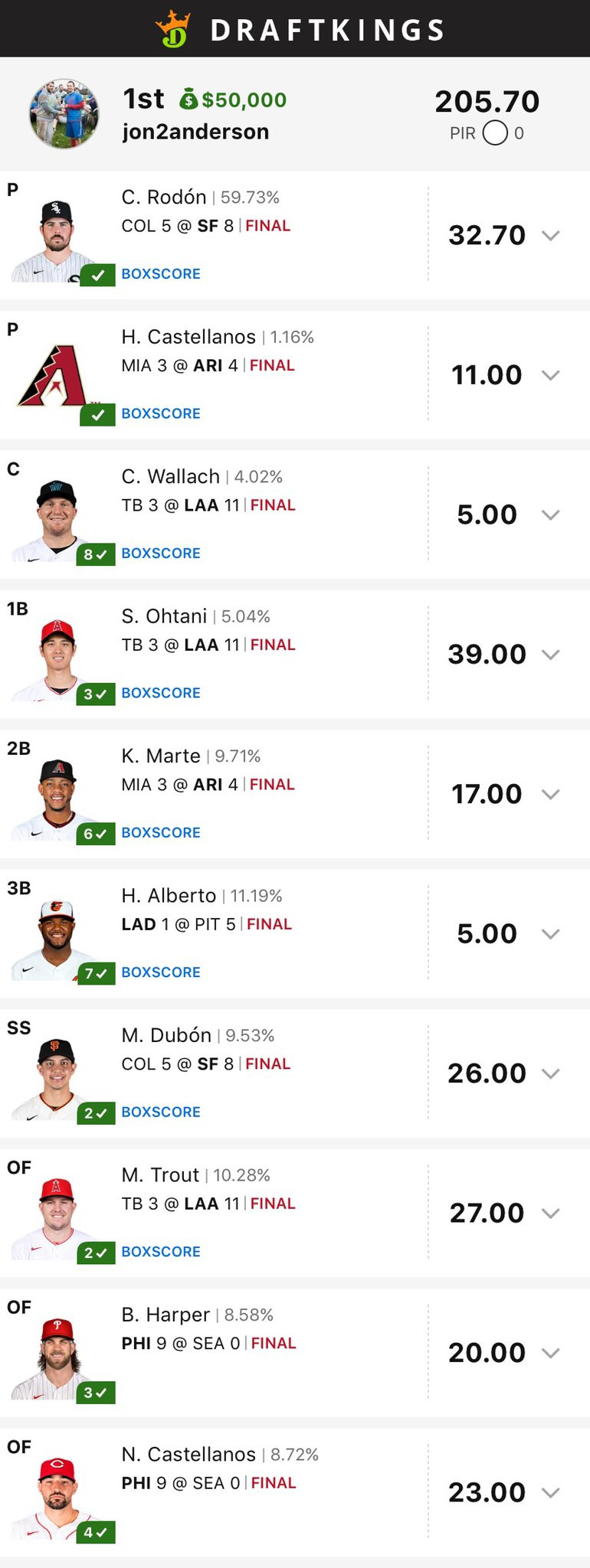 In reality, as always, this was just mainly a stroke of luck. I liked the Phillies and Angels last night, of course, and talked about them in the DFS notes & analysis article I sent out yesterday afternoon (in which I actually promised you all that I’d win a tournament this week!), but ending up with all the right guys together with Dubon and Ketel isn’t like some genius, strategic move - just a lucky thing to happen.