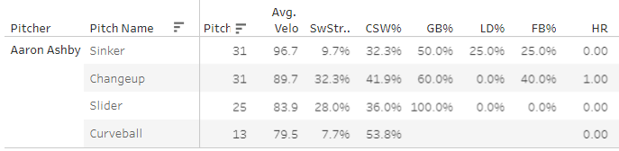 Aaron Ashby - 66 TBF, 39.4 K%, 7.6 BB%, 68.6% GB%