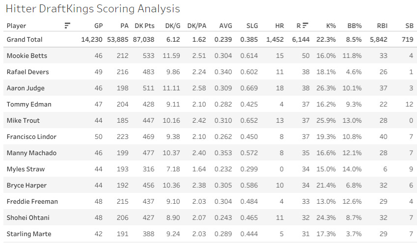 10. Mookie Betts (LAD) - 212.0 PA - 106.79 JA Points