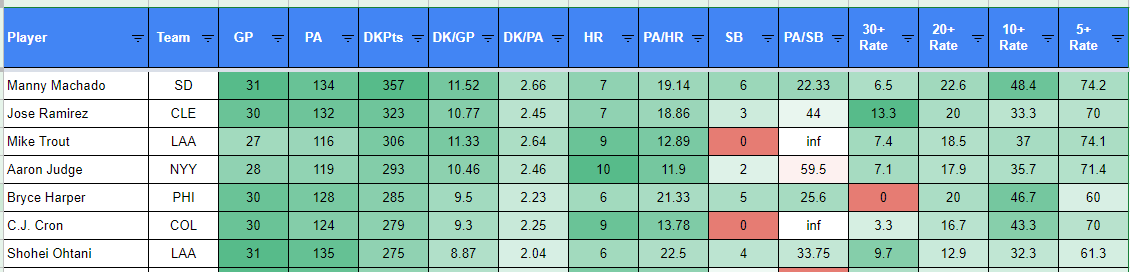 30+ Rate: Percent of games the hitter has scored 30+ DK points in