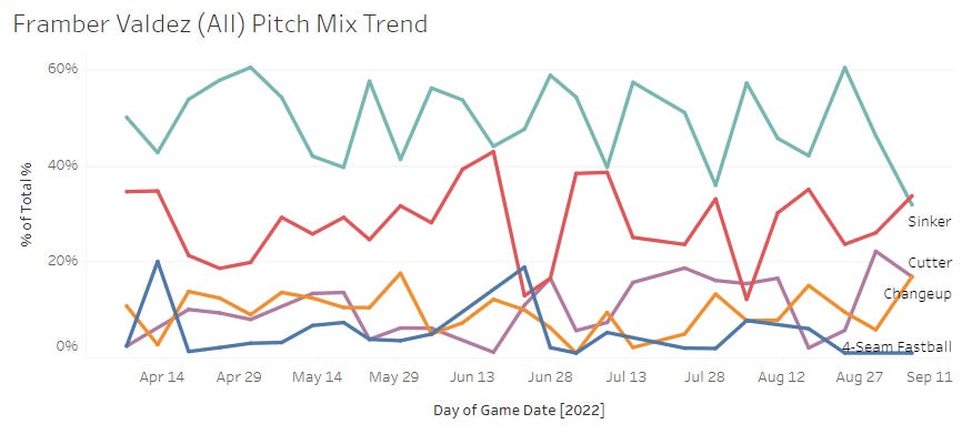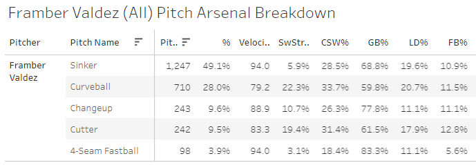 The curveball is the strikeout pitch, clearly. It seems to me that Valdez just picks if he wants to go for strikeouts or not, he knows the sinker is going to result in contact. Could be worth a deeper dive there but we don’t have time for it! You’re profiting off the Valdez pickup this year, big time.