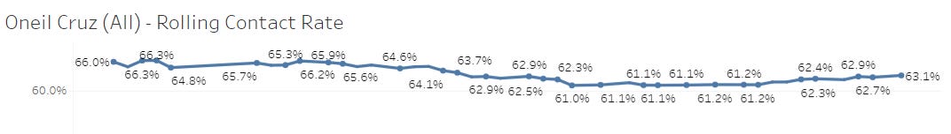 Oneil Cruz hit the two hardest balls of the night, but his K% and Contact% marks aren’t improving.