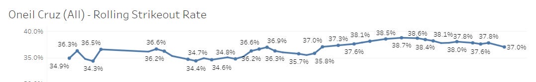 Oneil Cruz - 61 PA, 34 BIP, 9 Brls, 26.5 Brl%