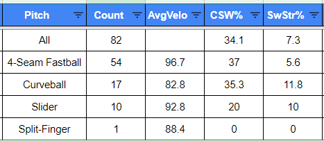 None of those swinging-strike rates are good, but he threw a lot of strikes - and that’s what you want to do against a bad lineup like Detroit. It’s also a ton of four-seamers (66%). Really not a convincing pitch arsenal, I’m hands-off of Brown for now.
