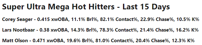 Matt Olson and Austin Riley are priority plays for me. Olson has a .347 xwOBA and 15 homers since July began, and he’s currently on all of the hot hitter indicators in the daily notes.