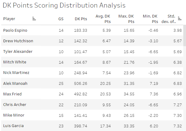 I just added this “Scoring Distribution” tab to the DraftKings Pitcher Scoring dashboard, you can use that to get an idea about consistency stuff like this.You can see that Fried and Manoea are the only two there with a high average and a strong consistency mark.