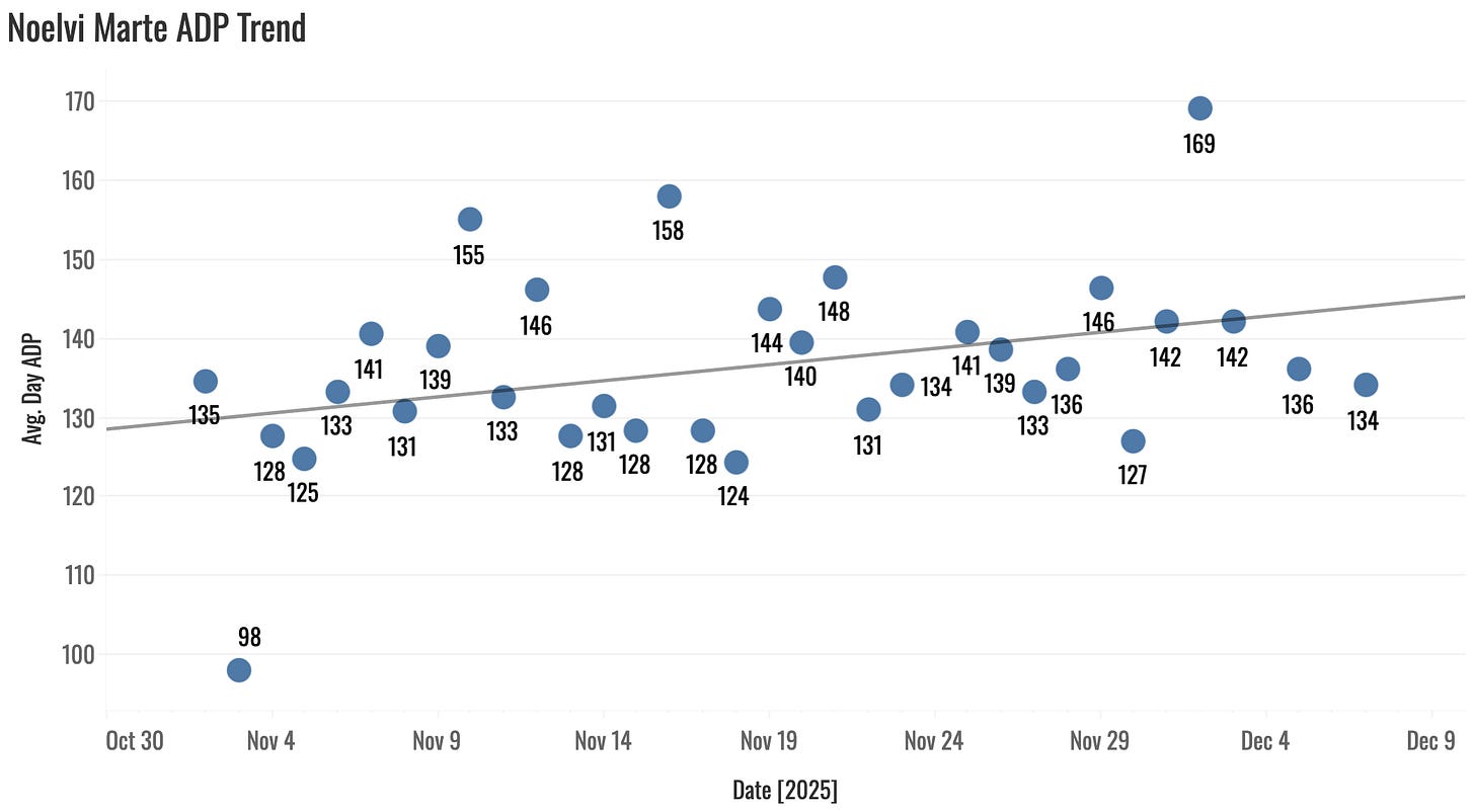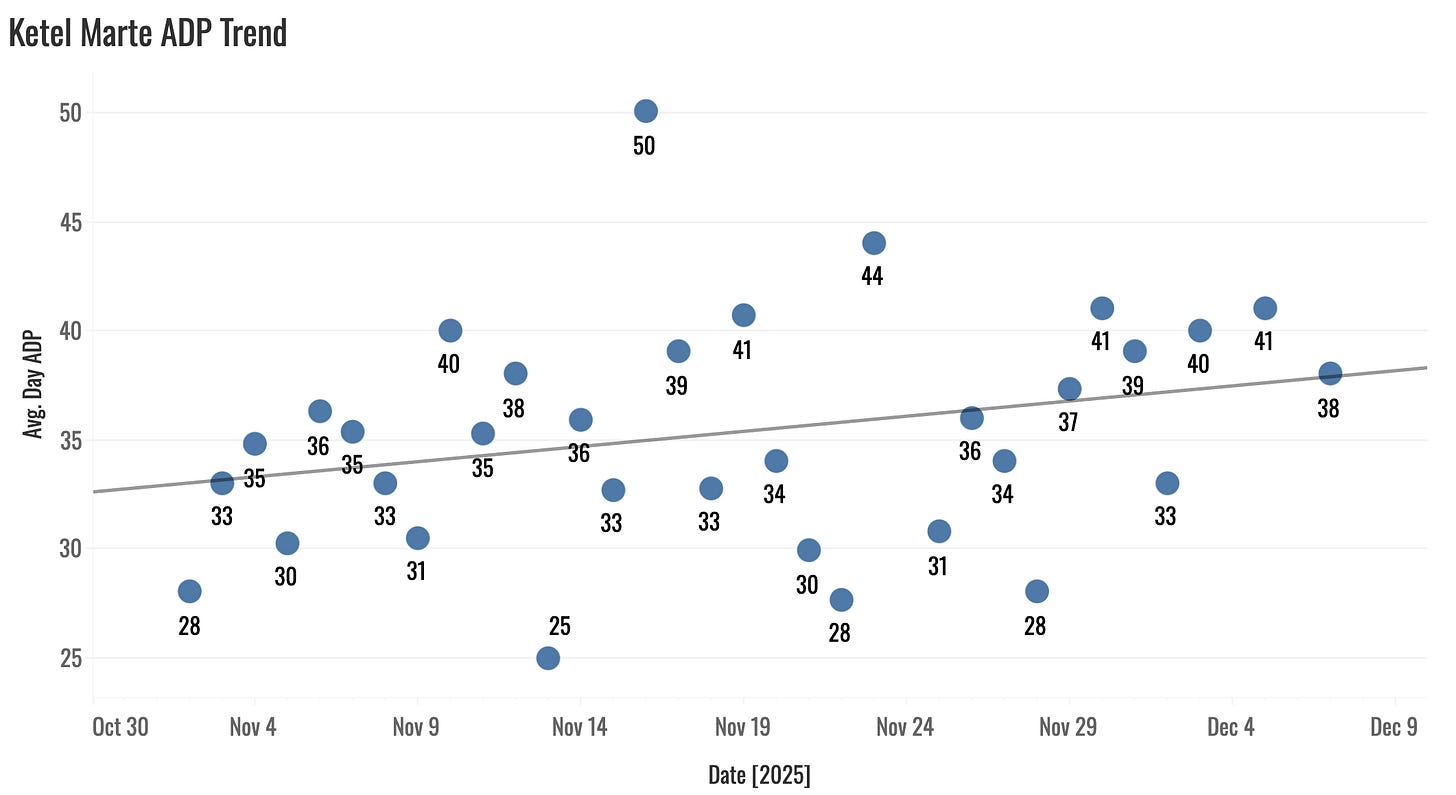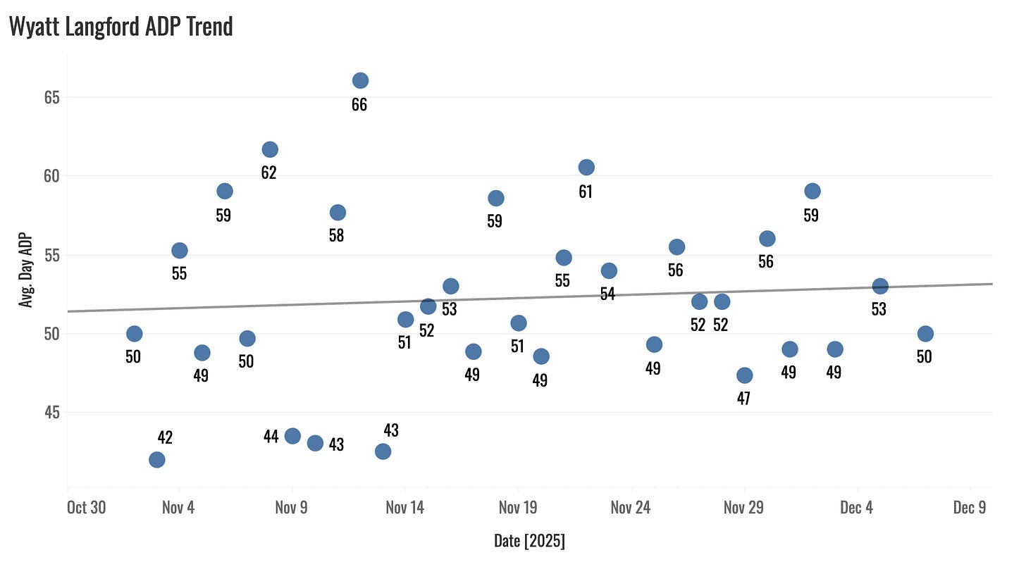With a full offseason to get the oblique stuff figured out and healthy, Langford comes into 2026 as a true 30-30-.275 threat. And you can get your hands on that well after the third round.