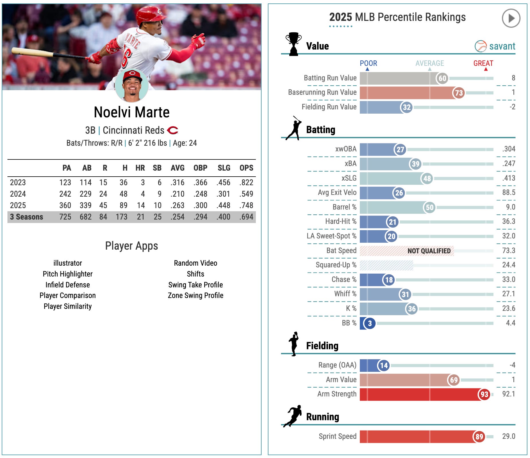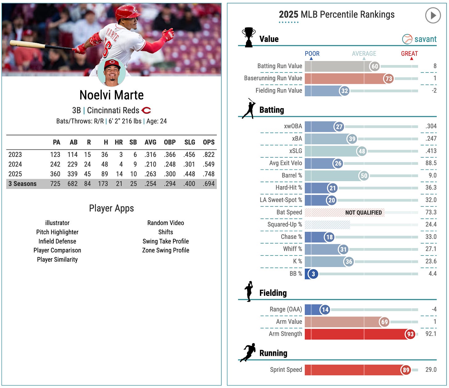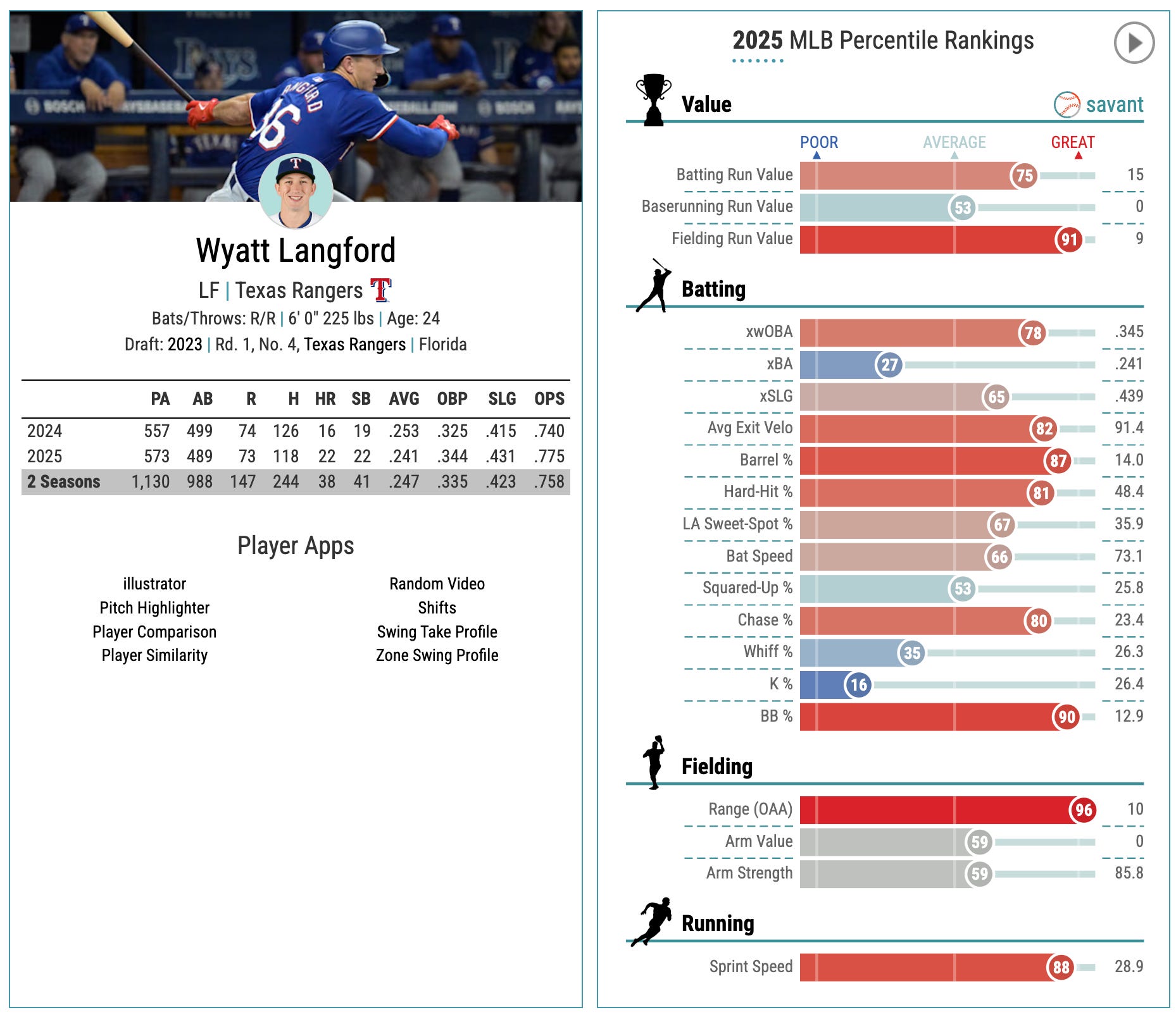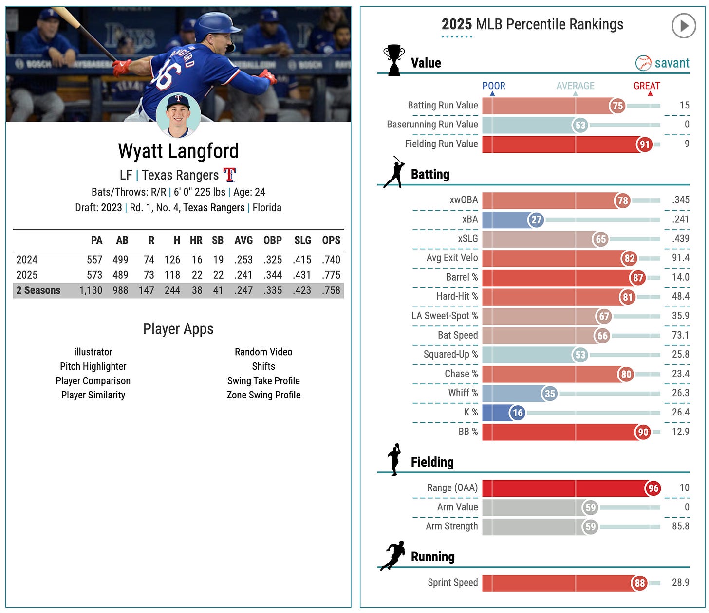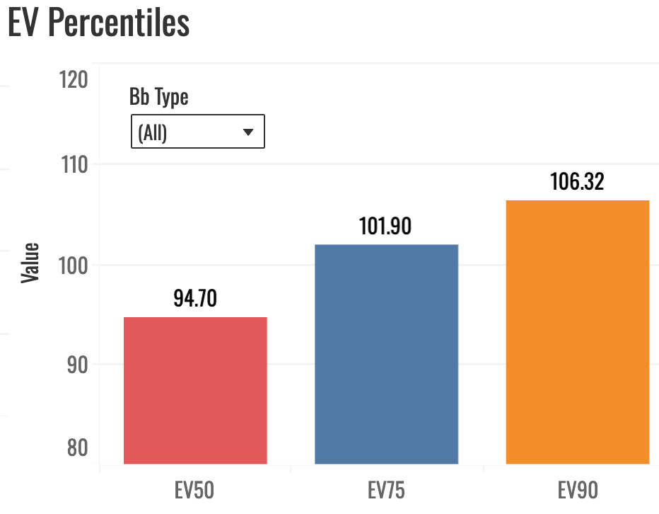 88th-percentile sprint speed, 66th-percentile bat speed, and a really nice batted ball profile resulting in that 78th-percentile xwOBA.