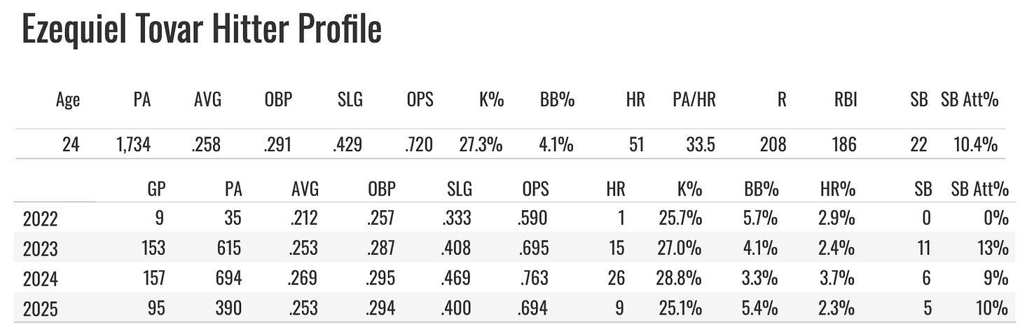 And that came at the same time as a career-best strikeout rate. Tovar posted a 105.3 EV90 with a 10% stolen base attempt rate. The guy has more power and speed than he’s given credit for.