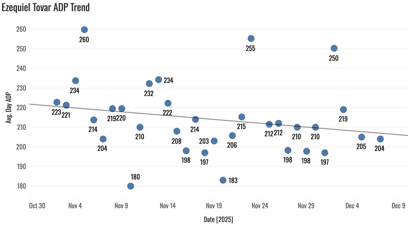 Close your eyes and guess how Ezequiel Tovar is. I bet you said 26. But no, he’s 24. My model has been loving this guy for a couple of years now, but we’re right back on him for 2026.