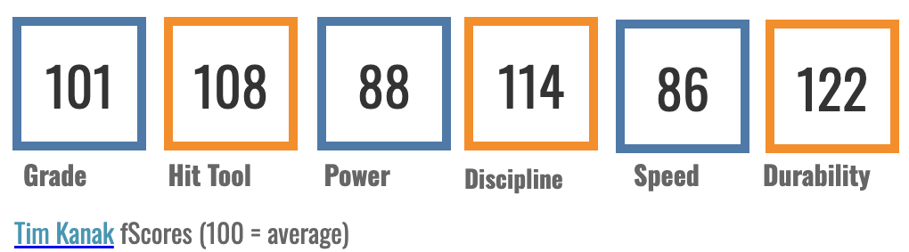His second-percentile bat speed will always keep him away from 20+ homers, I think. But what he does extremely well is get balls in play. Tim’s fScore model grades him for a 114 discipline, a 108 hit tool, and an overall 101 grade.