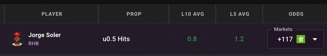 The Angels take on the nearly untouchable Chase Burns. Soler is boom-or-bust. He’s not a dude who racks up base knocks. There’s home run potential since the game’s in Cincy. But the guy is almost a sure thing to go down on strikes once, and we’re liking his chances of an “o-for” tonight.