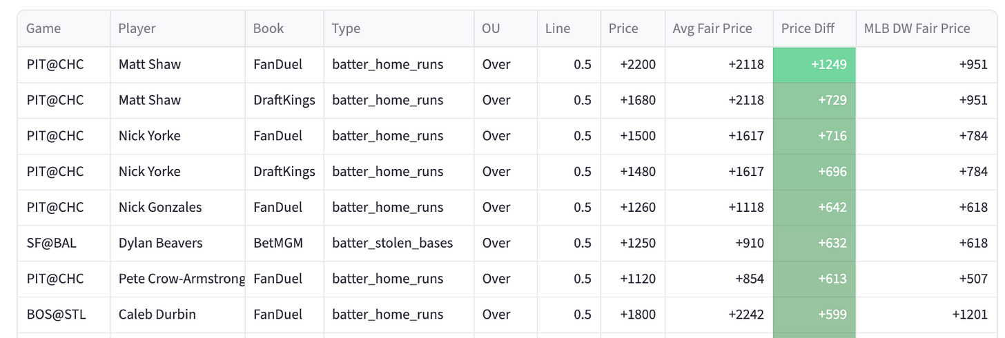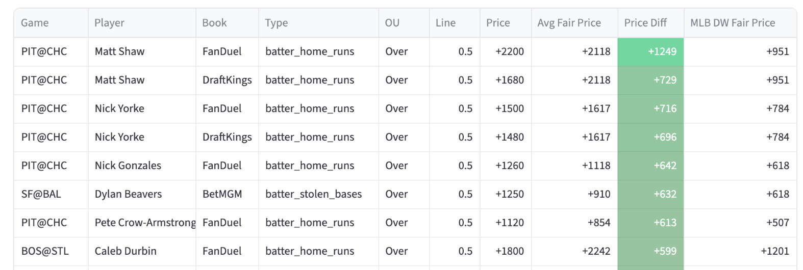 So we have Matt Shaw over 0.5 homers for +2200 on FanDuel as the best bet. My model would say that should be +951. Home run picks from this PIT@CHC game are popping a bunch. And that brings us to another unique situation.