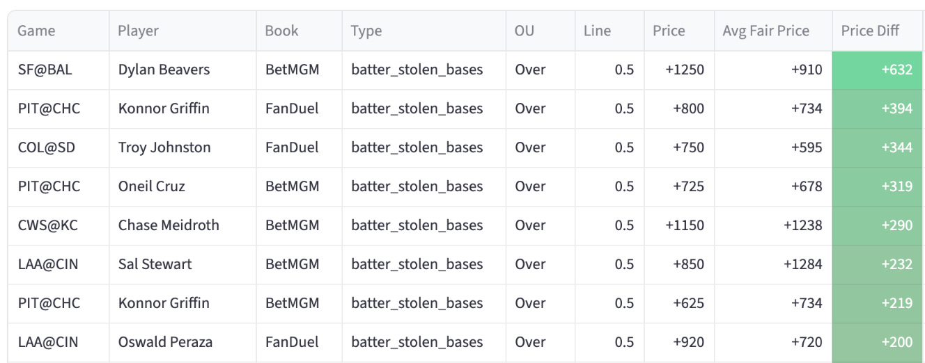Dylan Beavers is another good example. He hasn’t attempted a steal yet this year, but he was a 31-steal guy in 2024 and a 25-steal guy last year with 20% attempt rates. He shouldn’t be +1250.