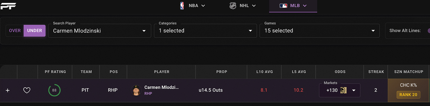 Mlodzinski has looked okay this year, but he’s still eclipsed five innings in just three of his 19 big league starts. He probably won’t give up a long ball today, which could help, but he just doesn’t have answers after he goes through the batting order the second time. The Pirates' bullpen is fresh after an off-day, and honestly, I think they’ll just stop even letting him get into the lineup the third time. There’s no reason to do it, he’s shown over and over again that he falls apart after that second time through.