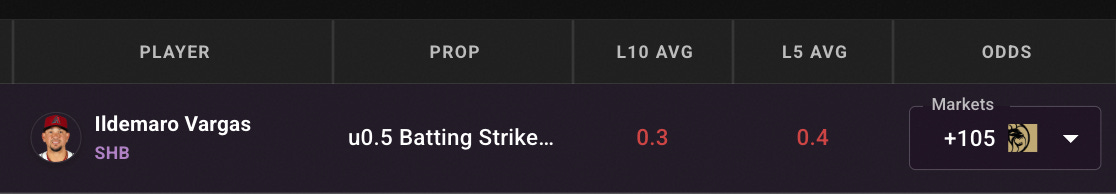 Ildemaro Vargas Under 0.5 Strikeouts +120