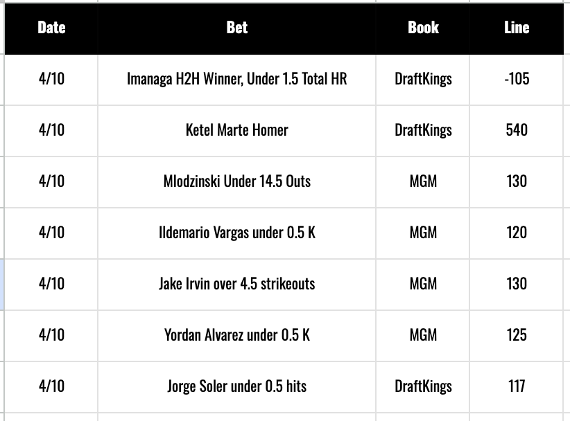 The under 1.5 homers was -180 when I got it, and Imanaga is a huge favorite to have more strikeouts than Mlodzinski. I got it for -105.