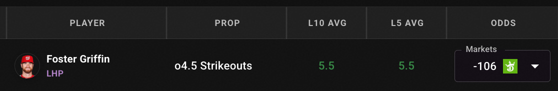 Foster Griffin Over 4.5 Strikeouts (-106 on DK)