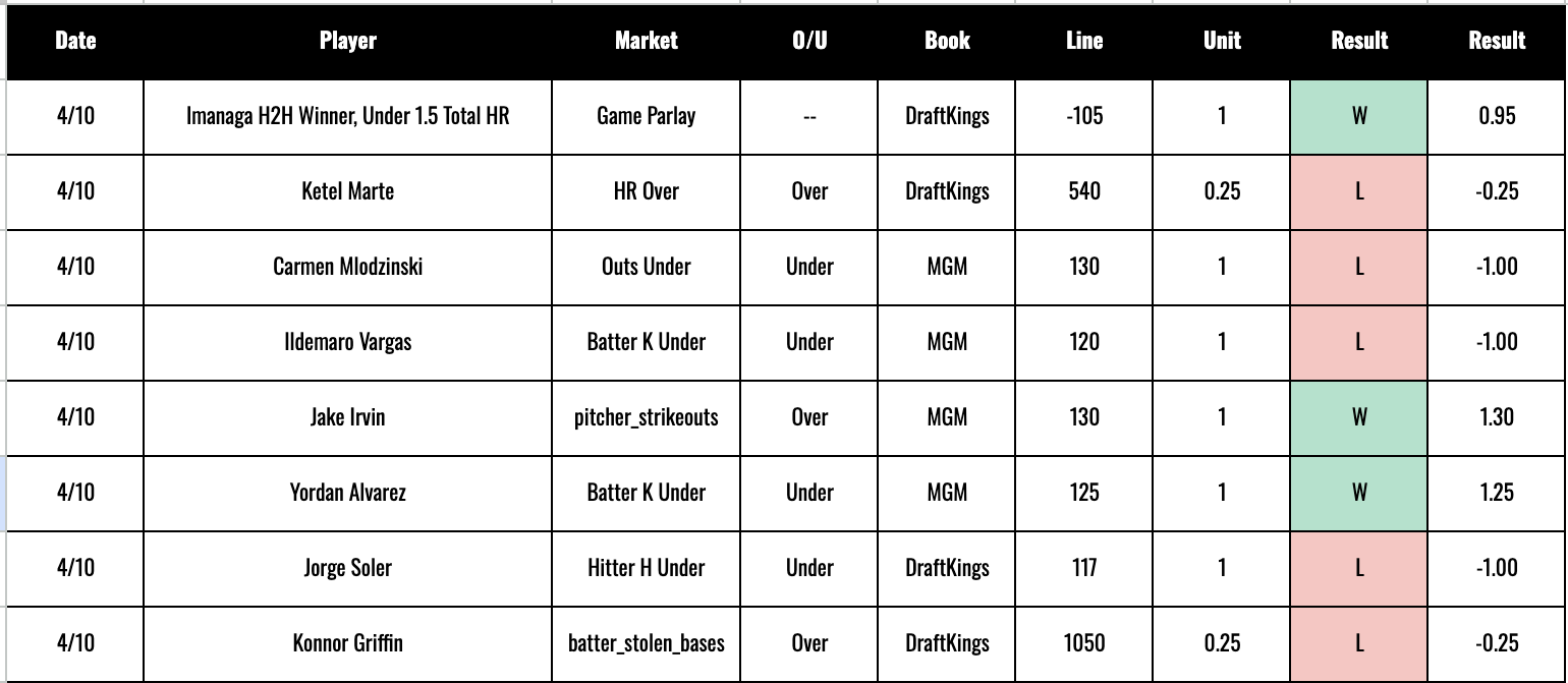 Opened things up yesterday with a day that resulted in an exact push. Just 3 wins on eight bets, but two of the L’s were long shots (Ketel Marte homer & Griffin SB) that we only put a quarter of a normal bet on. Nobody’s out here dropping the same amount on a +1050 bet as they are on a closer to 50/50 shot, right?