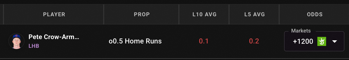 To be fair, it’s not a good home run hitting spot in Wrigley again, this time against another ground ball pitcher in Braxton Ashcraft. But +1200 is wild.