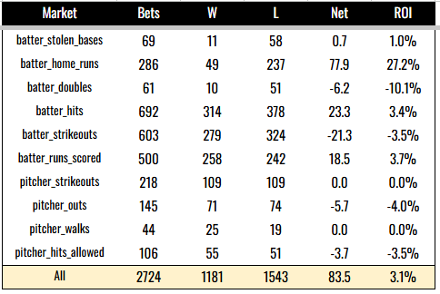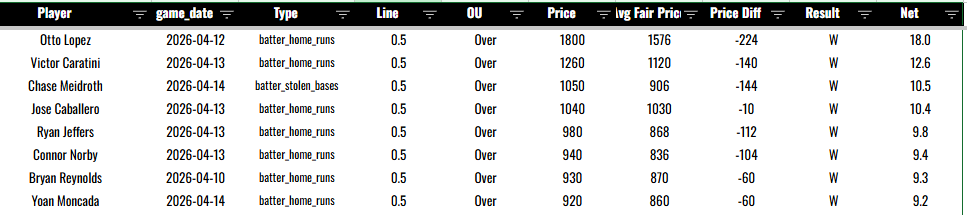 The tracker has begun. I am still working out some bugs and making sure everything is working in a way that makes sense. The early returns are crazy high on the home run bets, which I’m pretty skeptical of.