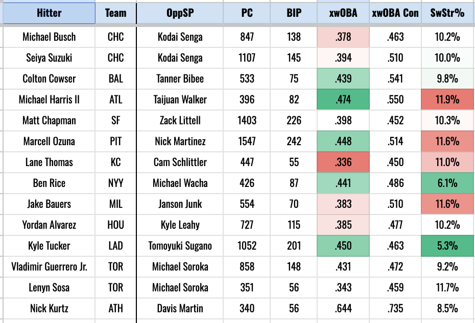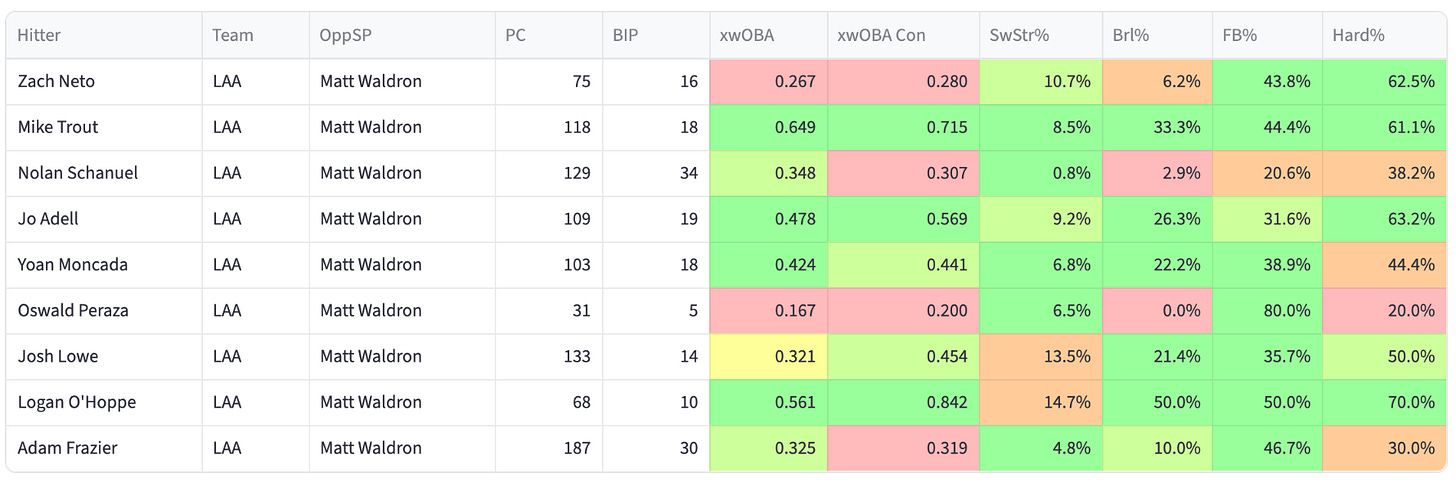 The Angels are also swinging really good bats this year. They’re striking out less and they have a ton of right-handed power in the lineup with Trout, Adell, Neto, O’Hoppe, and Soler all going pretty well this year. They’re the matchups model’s top offense.