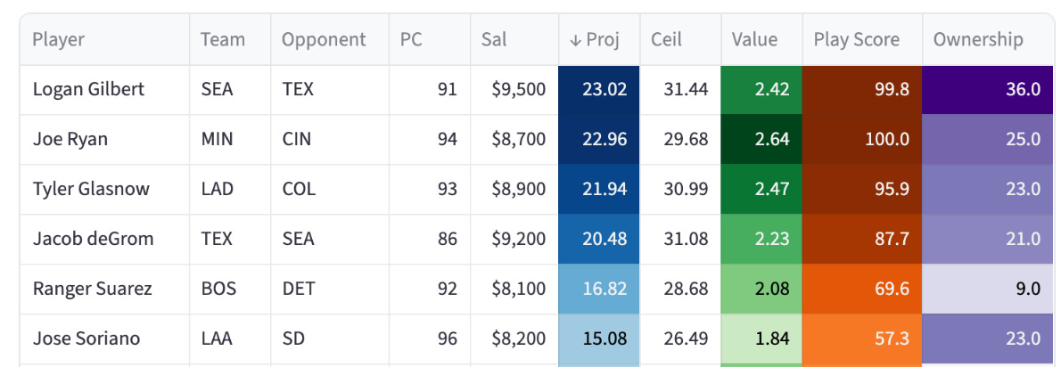 We stick to the studs when possible in cash. And we have five to pick from. I’m leaving Glasnow off the cash list, just because it’s Coors and we don’t need to take that extra risk with Gilbert/Ryan/deGrom/Schlittler on the board.