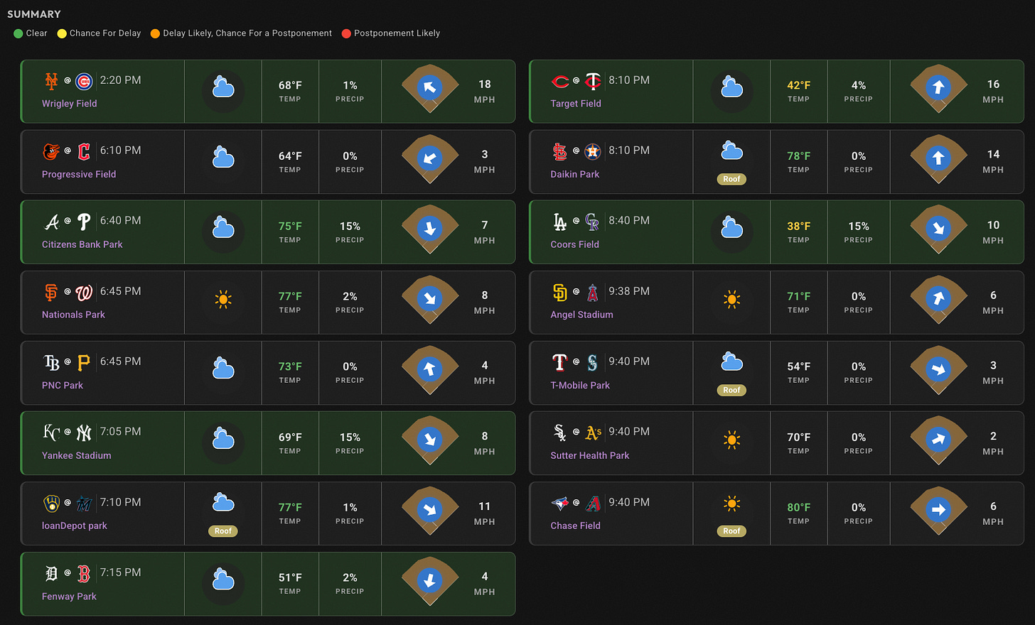 Wide range of temperatures around the league. We’re in the high 30s in Coors Field, and up into the high-70s elsewhere. But I’m not seeing any rain concerns.