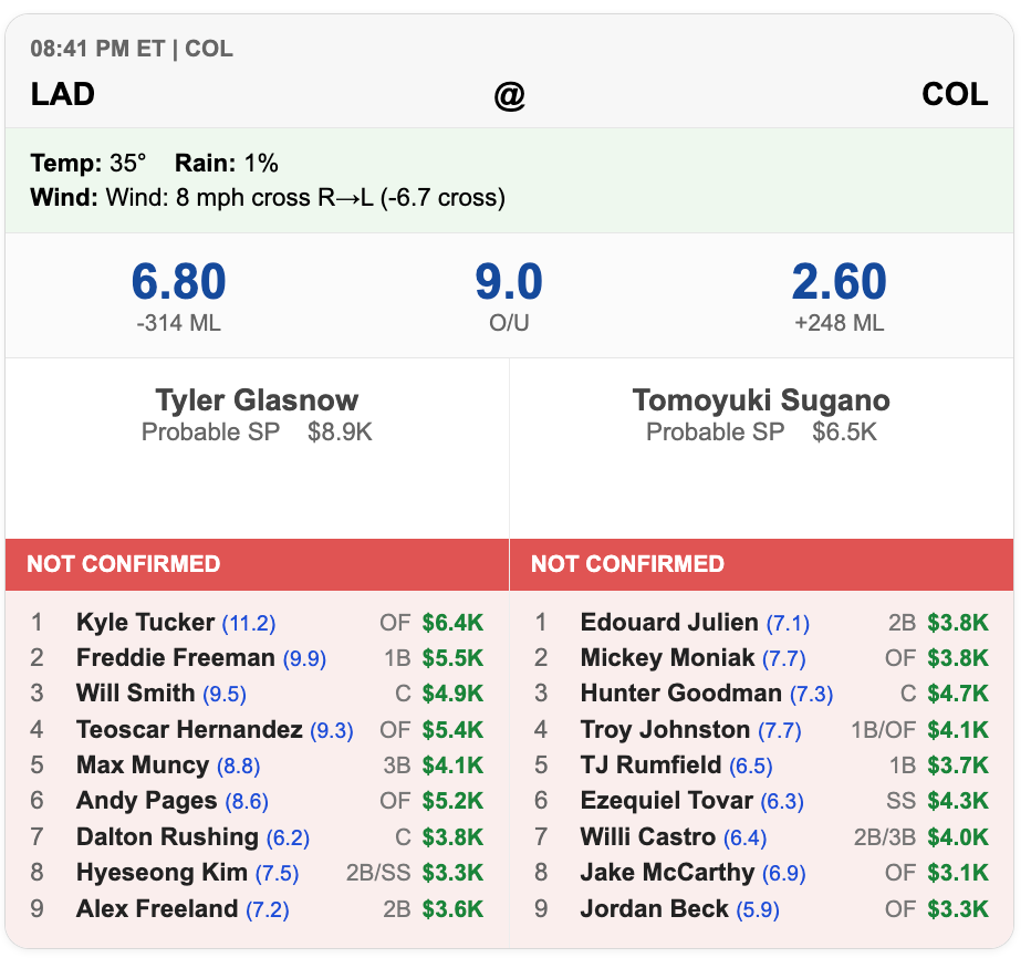 No surprise we have a chart-topping Dodgers offense in Coors. But we saw the low temp up there, that doesn’t help things.