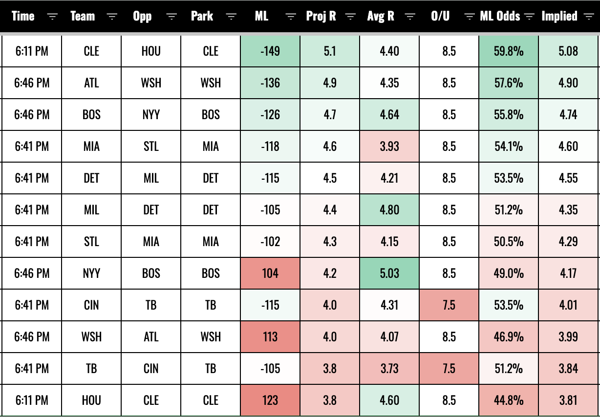 Roman Anthony is a big standout in the matchups model, although it’s a very small sample size. But we don’t need the matchups model to know that Anthony is a strong component of a Red Sox stack this evening.