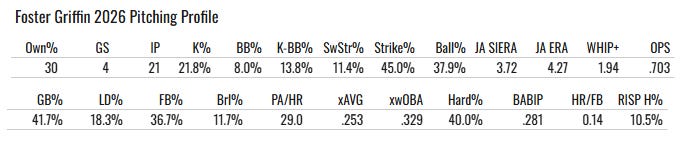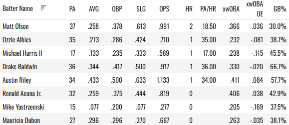 There are definitely numbers here that show he is ready for a blow-up start. A 40% hard hit rate, 0.329 xwOBA, and 36.7% FB%. In fact, Foster has given up one home run in three of four of his starts. I would attack this Atlanta offense as they can swing it well against lefties.
