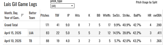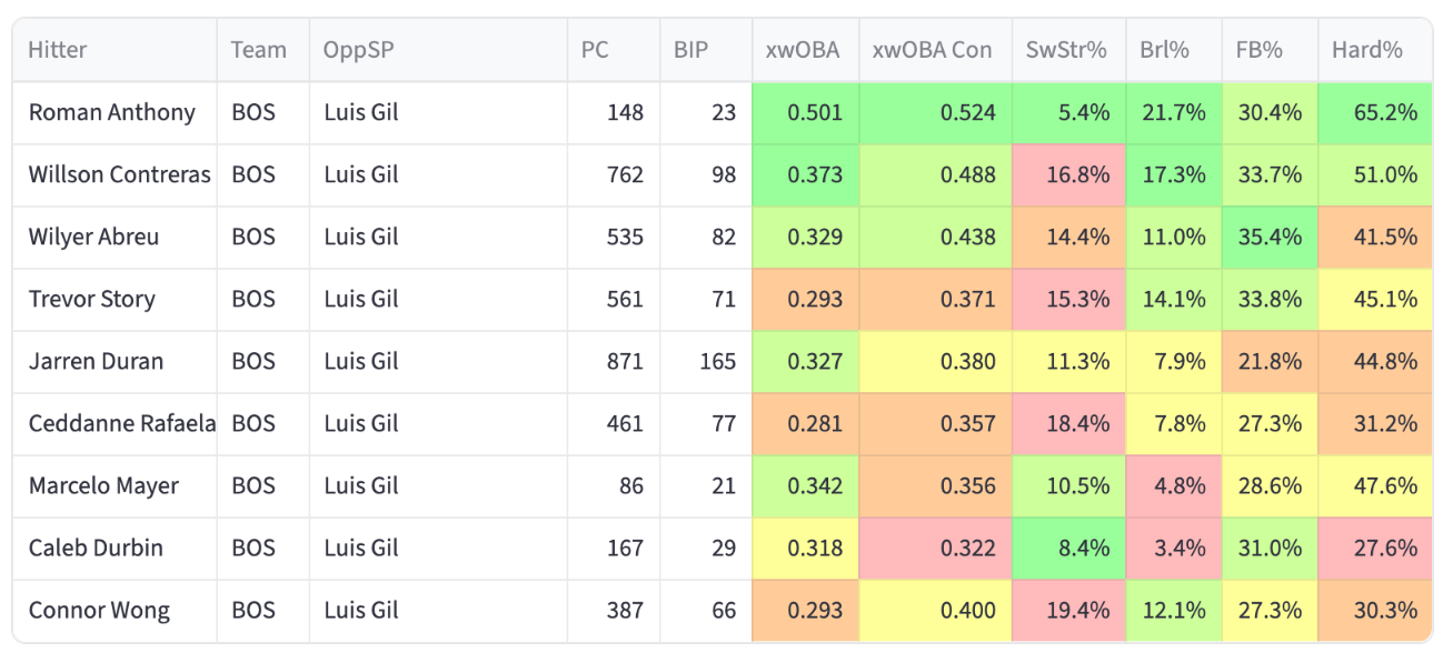 Four dingers in two starts. The Red Sox at home should feast against Gil, slam dunk pick. Not so fast? The Sox offense has struggled mightily to begin the season. Wilyer Abreu and Willson Contreras are the only two Boston hitters with an OPS above .800 against RHP this year.
