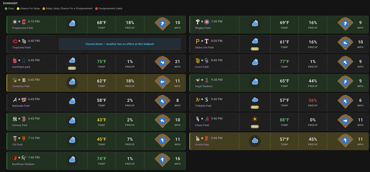 So plenty of great weather spots. The only fades for weather, in my opinion, would be Boston and NYM, since it will be in the low 40s at first pitch, but winds are blowing out at 10+ mph, so maybe they cancel each other out, and it’s an okay spot.